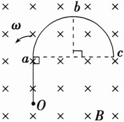 4. (2024·湖南卷,T4)如图,有一硬质导线 Oabc,其中 $ \overset{\frown}{abc} $ 是半径为 R 的半圆弧,b 为圆弧的中点,直线段 Oa 长为 R 且垂直于直径 ac。该导线在纸面内绕 O 点逆时针转动,导线始终在垂直纸面向里的匀强磁场中。则 O、a、b、c 各点电势关系为( )