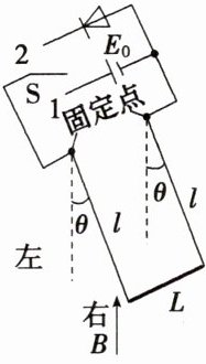 6. (2023·浙江 6 月·T10)如图所示,质量为 M、电阻为 R、长为 L 的导体棒,通过两根长均为 l、质量不计的导电细杆连在等高的两固定点上,固定点间距也为 L。细杆通过开关 S 可与直流电源 $ E_0 $ 或理想二极管串接。在导体棒所在空间存在磁感应强度方向竖直向上、大小为 B 的匀强磁场,不计空气阻力和其他电阻。开关 S 接 1,当导体棒静止时,细杆与竖直方向的夹角 $ \theta = \frac{\pi}{4} $;然后开关 S 接 2,棒从右侧开始运动完成一次振动的过程中( )