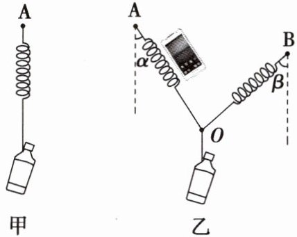 例 3 某同学用两根完全相同的轻弹簧和一瓶矿泉水等器材验证“力的平行四边形定则”。实验时,先将一弹簧一端固定在墙上的钉子 $ A $ 上,另一端挂矿泉水瓶,如图甲所示;然后将两弹簧一端分别固定在墙上的钉子 $ A $、$ B $ 上,另一端连接于结点 $ O $,在结点 $ O $ 挂矿泉水瓶,静止时用智能手机的测角功能分别测出 $ AO $、$ BO $ 与竖直方向的偏角 $ \alpha $、$ \beta $,如图乙所示。改变钉子 $ B $ 的位置,按照上述方法多测几次。