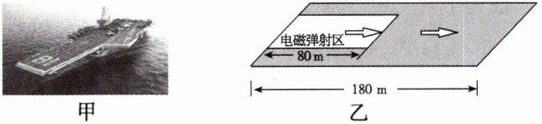 (多选)2024年7月,中国第三艘航空母舰“福建舰”完成了第三次海试。图甲所示是“福建舰”海试时的情境。图乙所示,假设航空母舰的水平跑道总长为$180m$,其中电磁弹射区的长度为$80m$,若弹射装置可以辅助飞机在弹射区做加速度为$40m/s^{2}$的匀加速直线运动,飞机离开电磁弹射区后在喷气式发动机推力作用下做匀加速直线运动,飞机离舰起飞速度为$100m/s$。已知航空母舰始终处于静止状态,飞机可视为质点,下列说法正确的是( )