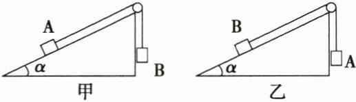 针对练 (多选)质量分别为$M$和$m$的物块A和B形状、大小均相同,将它们通过轻绳跨过光滑定滑轮连接,如图甲所示,绳子平行于倾角为$\alpha$的斜面,A恰好能静止在斜面上,不考虑A、B与斜面之间的摩擦,若互换两物块位置,按图乙放置,然后释放A,斜面仍保持静止,则下列说法正确的是( )