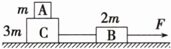 C 对A受力分析,A受重力、支持力和向右的静摩擦力作用,由此可以知道C受重力、A对C的压力、地面的支持力、绳子的拉力、A对C的摩擦力以及地面的摩擦力六个力作用,故A错误;对A、B、C整体分析,整体的加速度$a = \frac{F - \mu· 6mg}{6m} = \frac{F}{6m} - \mu g$,对A、C整体分析,根据牛顿第二定律得$F_T - \mu· 4mg = 4ma$,联立可得$F_T = \frac{2}{3}F$。即当$F = 1.5F_T$时,轻绳刚好被拉断,故B错误,C正确;若水平面光滑,绳刚要断时,对A、C整体分析,加速度$a = \frac{F_T}{4m}$,对A分析,A受到的摩擦力$F_f = ma = \frac{F_T}{4}$,故D错误。故选C。
