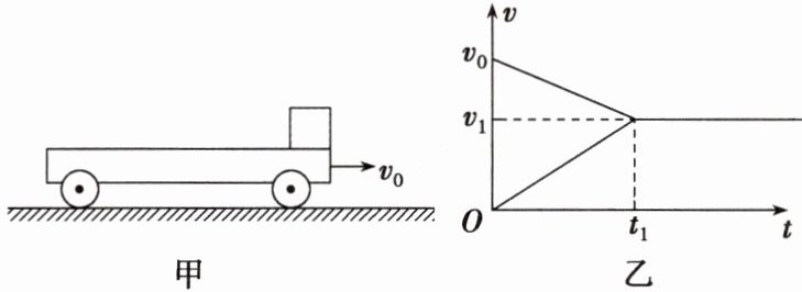 (多选)如图甲所示,上表面粗糙的平板小车静止于光滑水平面上。$t = 0$时,小车以速度$v_{0}$向右运动,将小滑块无初速度地放置于小车的右端,最终小滑块恰好没有滑出小车。如图乙为小滑块与小车运动的$v - t$图像,图中$t_{1}$、$v_{0}$、$v_{1}$均为已知量,重力加速度大小取$g$。由此可求得( )