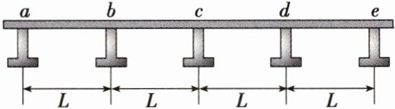 (2024·辽宁大连模拟)如图为大连星海湾大桥上的四段长度均为$L$的等跨连续桥梁,汽车从$a$处开始做匀减速直线运动,恰好行驶到$e$处停下。汽车通过$ab$段的平均速度为$v_{1}$,汽车通过$de$段的平均速度为$v_{2}$,则$\frac{v_{1}}{v_{2}}$满足( )