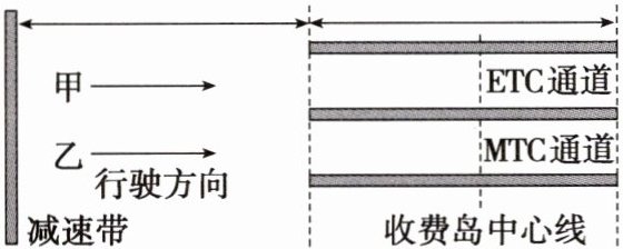 (2024·河北邢台联考)ETC是高速公路上不停车电子收费系统的简称。甲、乙两辆汽车分别通过ETC通道和人工收费通道(MTC)驶离高速公路,流程如图所示。假设收费岛总长度$d = 30m$,两辆汽车同时以相同的速度$v_{1} = 54km/h$经过距收费岛口$x = 30m$处的减速带后,一起以相同的加速度做匀减速运动。甲车减速至$v_{2} = 18km/h$后,匀速行驶到中心线即可完成缴费,自动栏杆打开放行;乙车刚好到收费岛中心线收费窗口停下,经过$t_{0} = 15s$的时间缴费成功,人工栏杆打开放行。随后两辆汽车匀加速到$v_{3} = 90km/h$速度后沿直线匀速行驶,设两车加速过程和减速过程中的加速度大小相等,求: