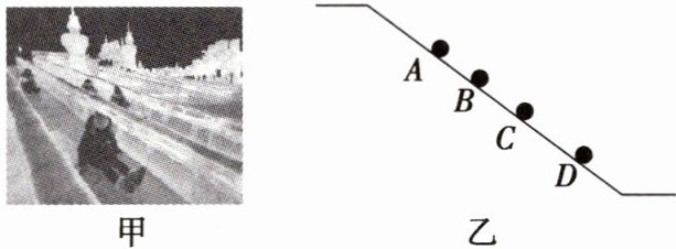 图甲为哈尔滨冰雪大世界游客排队滑冰滑梯的场景,在工作人员的引导下,每间隔相同时间从滑梯顶端由静止开始滑下一名游客,将某次拍到的滑梯上同时有多名游客的照片简化为如图乙所示,已知$AB$和$BC$间的距离分别为$2.5m$和$3.5m$。
