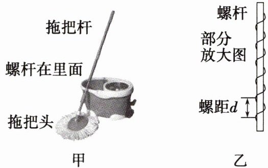 例1 如图甲所示为旋转脱水拖把。拖把杆内有一段长度为35cm的螺杆通过拖把杆下段与拖把头接在一起,螺杆的螺距(相邻螺纹之间的距离)$d = 5cm$,如图乙所示。拖把头的半径为10cm,拖把杆上段相对螺杆向下运动时拖把头就会旋转,把拖把头上的水甩出去。某次脱水时,拖把杆上段1s内匀速下压了35cm,该过程中拖把头匀速转动,下列说法正确的是( )