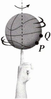 (2024·黑吉辽卷·T2·改编)“指尖转球”是花式篮球表演中常见的技巧。如图,当篮球在指尖上绕轴转动时,球面上$P$、$Q$两点做圆周运动。