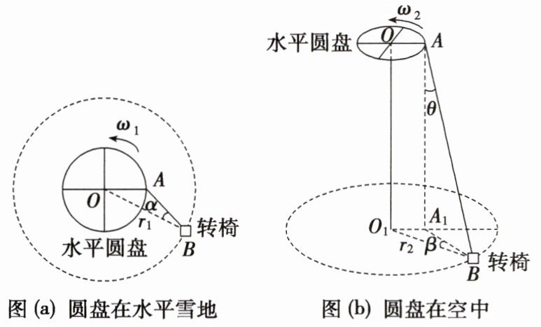 (1)在图(a)中,若圆盘在水平雪地上以角速度$\omega_{1}$匀速转动,转椅运动稳定后在水平雪地上绕$O$点做半径为$r_{1}$的匀速圆周运动。求$AB$与$OB$之间夹角$\alpha$的正切值。