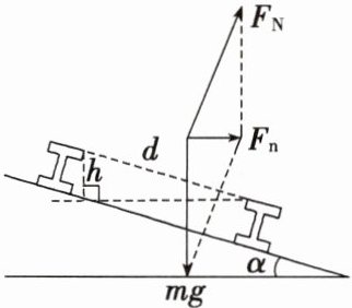 例6 (2024·河南平顶山质检)火车转弯时的受力分析如图所示,铁路转弯处的圆弧半径为$R$,两铁轨之间的距离为$d$,内外轨的高度差为$h$,铁轨平面和水平面间的夹角为$\alpha$($\alpha$很小,可近似认为$\tan\alpha\approx\sin\alpha$),重力加速度为$g$,下列说法正确的是( )