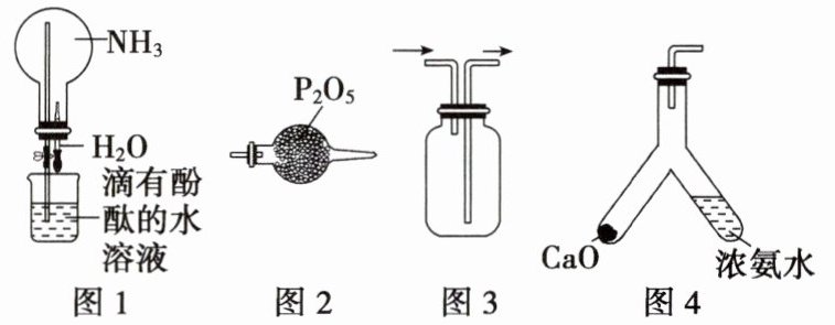 4.B $\mathrm{NH_3}$极易溶于水,溶于水后圆底烧瓶内压强减小,从而产生喷泉,故A可以达到预期目的;$\mathrm{P_2O_5}$为酸性氧化物,$\mathrm{NH_3}$具有碱性,两者可以发生反应,故不可以用$\mathrm{P_2O_5}$干燥$\mathrm{NH_3}$,故B不可以达到预期目的;$\mathrm{NH_3}$的密度比空气小,集气瓶正放,则需要短进长出,故C可以达到预期目的;$\mathrm{CaO}$与浓氨水混合后与水反应并放出大量的热,促使$\mathrm{NH_3}$挥发,可用此装置制备$\mathrm{NH_3}$,故D可以达到预期目的。