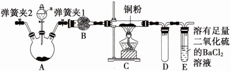 检查装置气密性的方法是打开弹簧夹 1,关闭弹簧夹 2 和分液漏斗的活塞,在 E 中加入适量的水至长导管淹没,