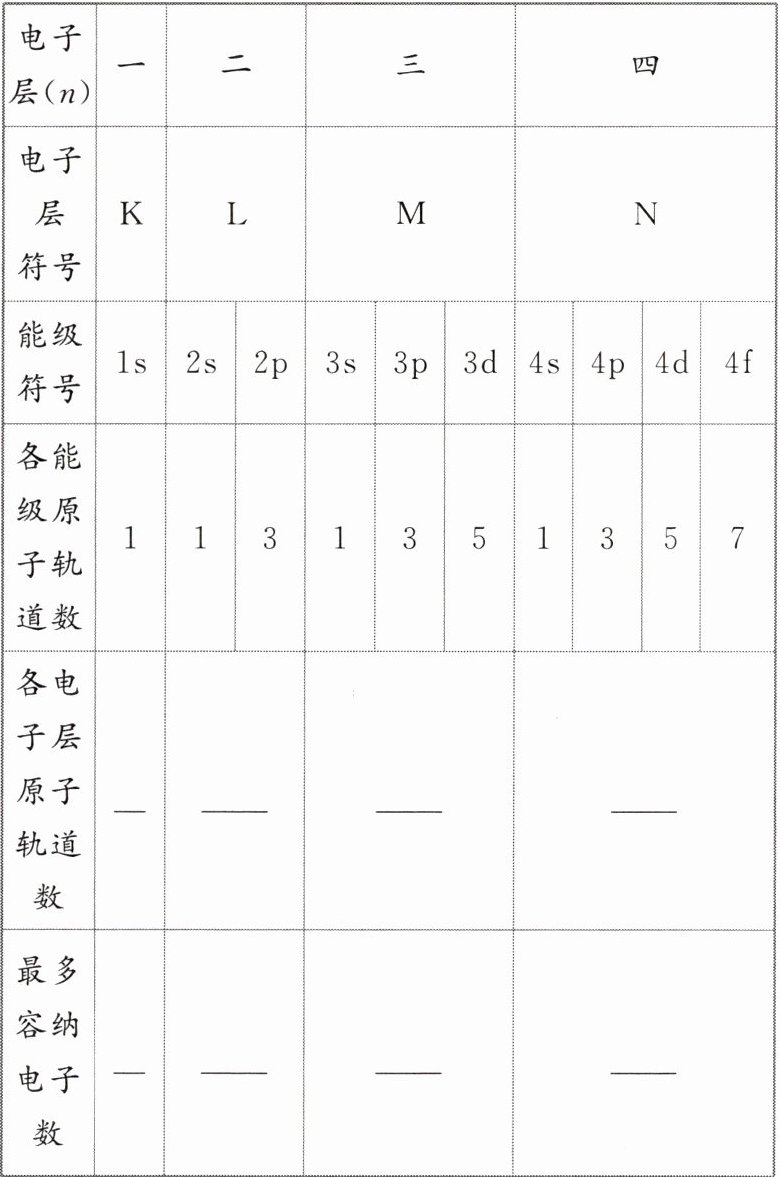 核外电子按能量不同分成能层,同一能层的电子,还被分成不同能级。量子力学把电子在原子核外的一个空间运动状态称为一个原子轨道。