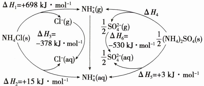 ③Cl⁻(g)=Cl⁻(aq) ΔH₃=-378 kJ·mol⁻¹;$④ \frac{1}{2}(NH₄)₂SO₄(s) =NH₄⁺(g)+ \frac{1}{2}SO₄²⁻(g) ΔH₄;$$⑤ \frac{1}{2}(NH₄)₂SO₄(s)= NH₄⁺(aq)+ \frac{1}{2}SO₄²⁻(aq) ΔH₅=+3 kJ·mol⁻¹;$$⑥ \frac{1}{2}SO₄²⁻(g)= \frac{1}{2}SO₄²⁻(aq) ΔH₆=-530 kJ·mol⁻¹;$则⑤+①-⑥-②+③得④, ΔH₄=+838 kJ·mol⁻¹。