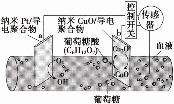 4. (2024·新课标卷)一种可植入体内的微型电池工作原理如图所示,通过 $ {CuO} $ 催化消耗血糖发电,从而控制血糖浓度。当传感器检测到血糖浓度高于标准,电池启动;血糖浓度下降至标准,电池停止工作。(血糖浓度以葡萄糖浓度计)