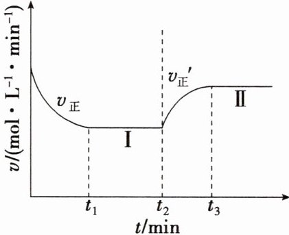 3. 已知:$A(g) + 2B(g) \rightleftharpoons 3C(g)$ $\Delta H < 0$,向一恒温恒容的密闭容器中充入发生反应,$t_1$时达到平衡状态Ⅰ,在 $t_2$ 时改变某一条件,$t_3$ 时重新达到平衡状态Ⅱ,正反应速率随时间的变化如图所示。$t_2$ 时改变的条件:。