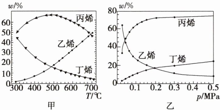 (1)由题图甲可知,300℃时C₂H₄(g)的质量分数接近于0,而温度升高,C₂H₄(g)的质量分数增大,故选择300℃;由题图乙可知,压强增大,C₂H₄(g)的质量分数减小,C₃H₆(g)的质量分数增大,故选0.5MPa,因此控制反应条件为300℃、0.5MPa。