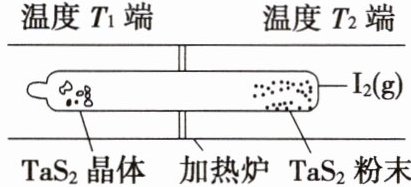 (1) 利用“化学蒸气转移法”制备 $ TaS_2 $ 晶体,发生反应:$ TaS_2(s) + 2I_2(g) \rightleftharpoons TaI_4(g) + S_2(g) $ $ \Delta H > 0 $(Ⅰ)。如图所示,反应(Ⅰ)在石英真空管中进行,先在温度为 $ T_2 $ 的一端放入未提纯的 $ TaS_2 $ 粉末和少量 $ I_2(g) $,一段时间后,在温度为 $ T_1 $ 的一端得到了纯净 $ TaS_2 $ 晶体,则温度 $ T_1 $