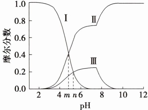 3.C 在溶液中存在平衡:①$CH_3COOH \rightleftharpoons CH_3COO^- + H^+$,②$Ag^+ + CH_3COO^- \rightleftharpoons CH_3COOAg(aq)$,$Ag^+$的水解平衡③$Ag^+ + H_2O \rightleftharpoons AgOH + H^+$,随着pH的增大,$c(H^+)$减小,平衡①③正向移动,$c(CH_3COOH)$、$c(Ag^+)$减小,pH较小时(约小于7.8)$CH_3COO^-$浓度增大的影响大于$Ag^+$浓度减小的影响,$CH_3COOAg$浓度增大,pH较大时(约大于7.8)$CH_3COO^-$浓度增大的影响小于$Ag^+$浓度减小的影响,$CH_3COOAg$浓度减小,故线Ⅰ表示$CH_3COOH$的摩尔分数随pH变化的关系,线Ⅱ表示$CH_3COO^-$的摩尔分数随pH变化的关系,线Ⅲ表示$CH_3COOAg$随pH变化的情况,A项错误;由图可知pH=n时,$c(CH_3COOH)=c(CH_3COOAg)$,代入整理得$c(Ag^+)=\frac{10^{-n}}{K}$mol/L,C项正确;根据元素守恒,pH=10时溶液中$c(Ag^+)+c(CH_3COOAg)+c(AgOH)=0.08$mol/L,D项错误。