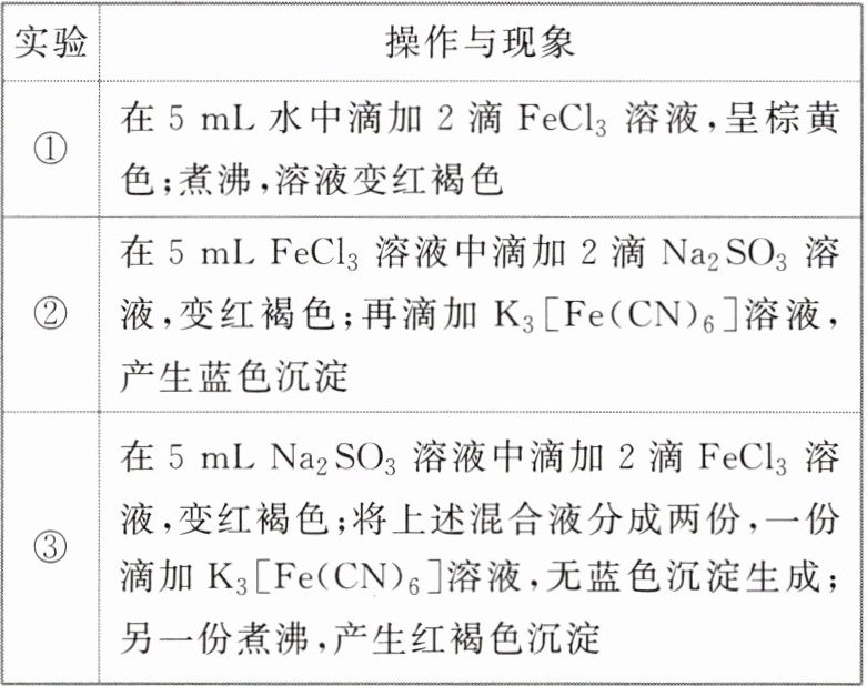 2.D 铁离子的水解反应为吸热反应,加热煮沸可促进水解平衡正向移动,使水解程度加深,生成较多的氢氧化铁,从而使溶液显红褐色,A正确;根据实验②现象分析可知,$Fe^{3+}$既发生了水解反应,生成红褐色的氢氧化铁,又被亚硫酸根离子还原,生成亚铁离子,加入铁氰化钾溶液后,生成蓝色沉淀,故B正确;实验③根据溶液变红褐色,说明$Fe^{3+}$发生水解反应,滴加$K_3[Fe(CN)_6]$溶液无蓝色沉淀产生,说明没有发生还原反应,故C正确;结合实验①、③可知,$SO_4^{2-}$对$Fe^{3+}$的水解反应有影响,故D错误。