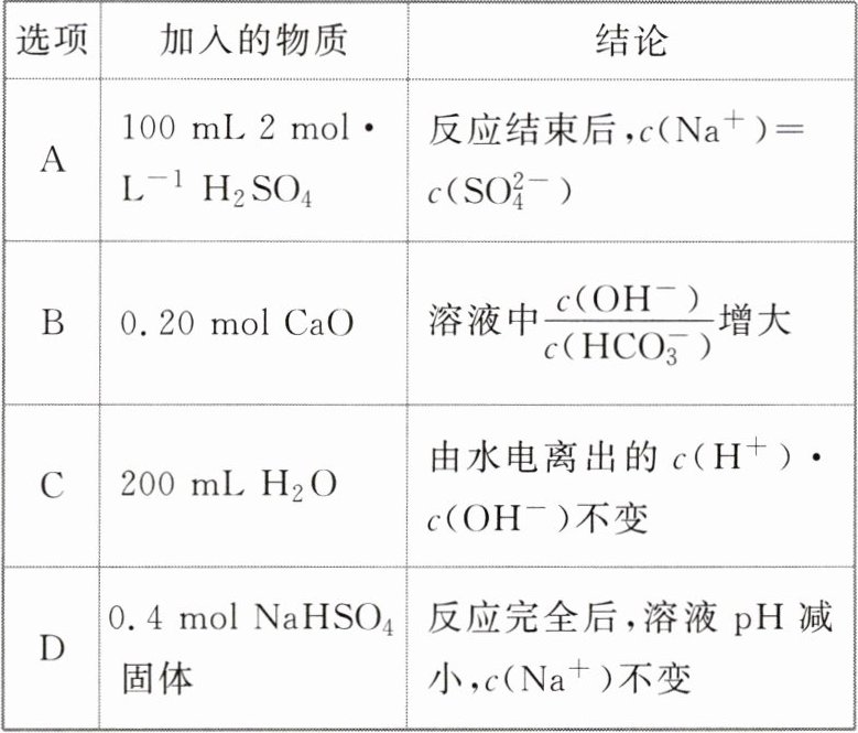 2.B $n(H_2SO_4)=2\ mol·L^{-1}×0.1\ L=0.2\ mol$,$H_2SO_4$和$Na_2CO_3$二者恰好反应生成强酸强碱盐$Na_2SO_4$,则$c(Na^+)=2c(SO_4^{2-})$,故A错误;$CaO + H_2O \longrightarrow Ca(OH)_2$、$Ca(OH)_2 + Na_2CO_3 \longrightarrow CaCO_3\downarrow + 2NaOH$,随着$CO_3^{2-}$的消耗,$CO_3^{2-} + H_2O \rightleftharpoons HCO_3^- + OH^-$向左移动,$c(HCO_3^-)$减小,反应生成$OH^-$,则$c(OH^-)$增大,导致溶液中$\frac{c(OH^-)}{c(HCO_3^-)}$增大,故B正确;加水稀释,促进碳酸钠水解,则由水电离出的$n(H^+)$、$n(OH^-)$都增大,但氢离子、氢氧根离子物质的量增大倍数小于溶液体积增大倍数,$c(H^+)$、$c(OH^-)$减小,二者浓度之积减小,故C错误;$NaHSO_4$和$Na_2CO_3$反应的化学方程式为$2NaHSO_4 + Na_2CO_3 \longrightarrow 2Na_2SO_4 + H_2O + CO_2\uparrow$,则溶液的pH减小,$c(Na^+)$增大,故D错误。