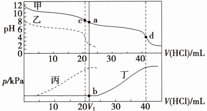 A.图中甲、丁线表示向$NaHCO_3$溶液中滴加盐酸,乙、丙线表示向$Na_2CO_3$溶液中滴加盐酸