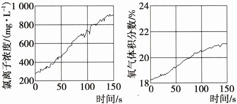 (1)解释两图中曲线变化的原因:氯水中的$HClO$ 见光分解生成 $HCl$ 和 $O_{2}$,$HClO$ 浓度减小,平衡 $Cl_{2} + H_{2}O \rightleftharpoons HCl + HClO$ 正向移动,$Cl^{-}$ 浓度增大,$O_{2}$ 体积分数增大。
