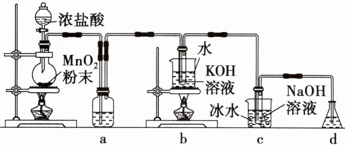 (2)b 中采用的加热方式是水浴加热,c中化学反应的离子方程式是$\boldsymbol{Cl_{2}$$+ 2OH^{-} = Cl^{-} + ClO^{-} + H_{2}O}$,采用冰水浴冷却的目的是防止生成$NaClO_{3}$。