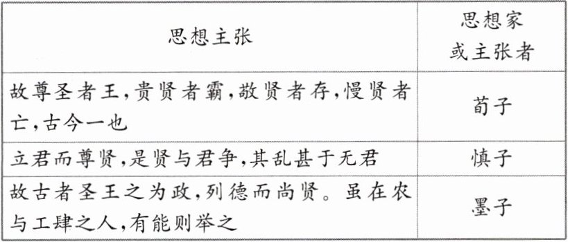 视角1 战国时期社会经历着巨大变革。不同学派代表人物对选贤能的主张都是“百家争鸣”的体现。荀子和慎子为君主治国提供了不同的用人建议:荀子主张贵贤、敬贤,慎子主张尊君轻贤;墨子和李悝主张用人不论出身,以才能和功劳为用人标准;商鞅变法时则实行奖励耕织和奖励军功的举措。他们的这些主张是我国由奴隶制向封建制转变、从分裂走向统一时代要求的反映,打破了世卿世禄制度,促进了社会阶层流动,推动了社会进步和历史发展。