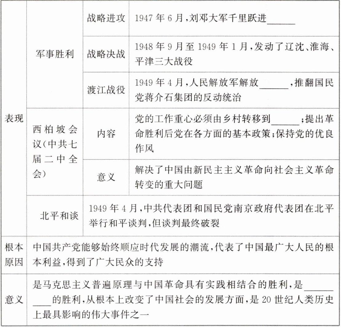 》,废除封建性及半封建性剥削制度。② 意义:亿万农民在政治上、经济上获得了解放,他们积极支援解放战争,成为解放战争取得胜利的重要保证。