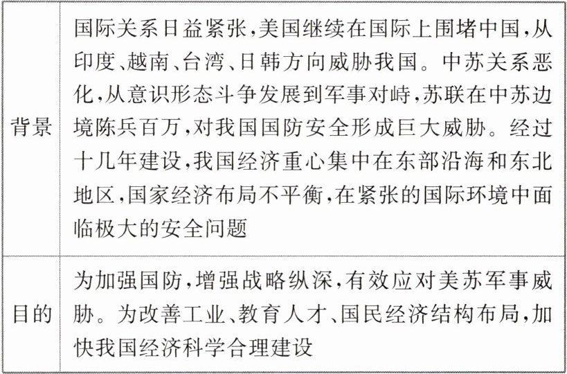 理由:地理上,该地区地形复杂,能源资源丰富,利于持久作战。国防上,中苏关系破裂,苏联陈兵北方,威胁北方安全;越南战争升级,中美局势紧张,威胁沿海地区;中国海军空军实力薄弱,难以御敌于国门之外。经济上,中国工业集中在沿海和东北,平衡工业布局的考虑。