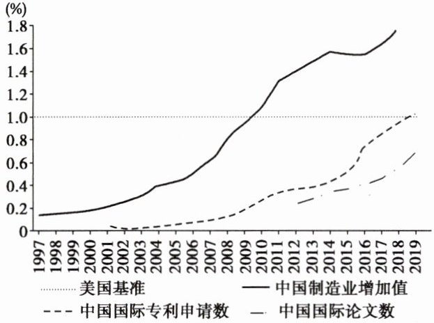 变式训练5. (2024·北京朝阳区一模) 以下为1997—2019年中美科技相对变化趋势图(美国各项指标设为1),对中国数据分析准确的是(