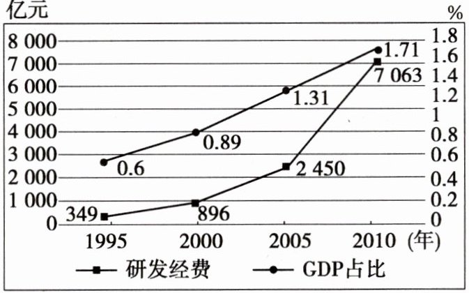真题5. (2024·重庆卷) 下图反映的是1995—2010年中国研发经费及投入强度(研发经费与GDP之比)情况。这体现了中国(