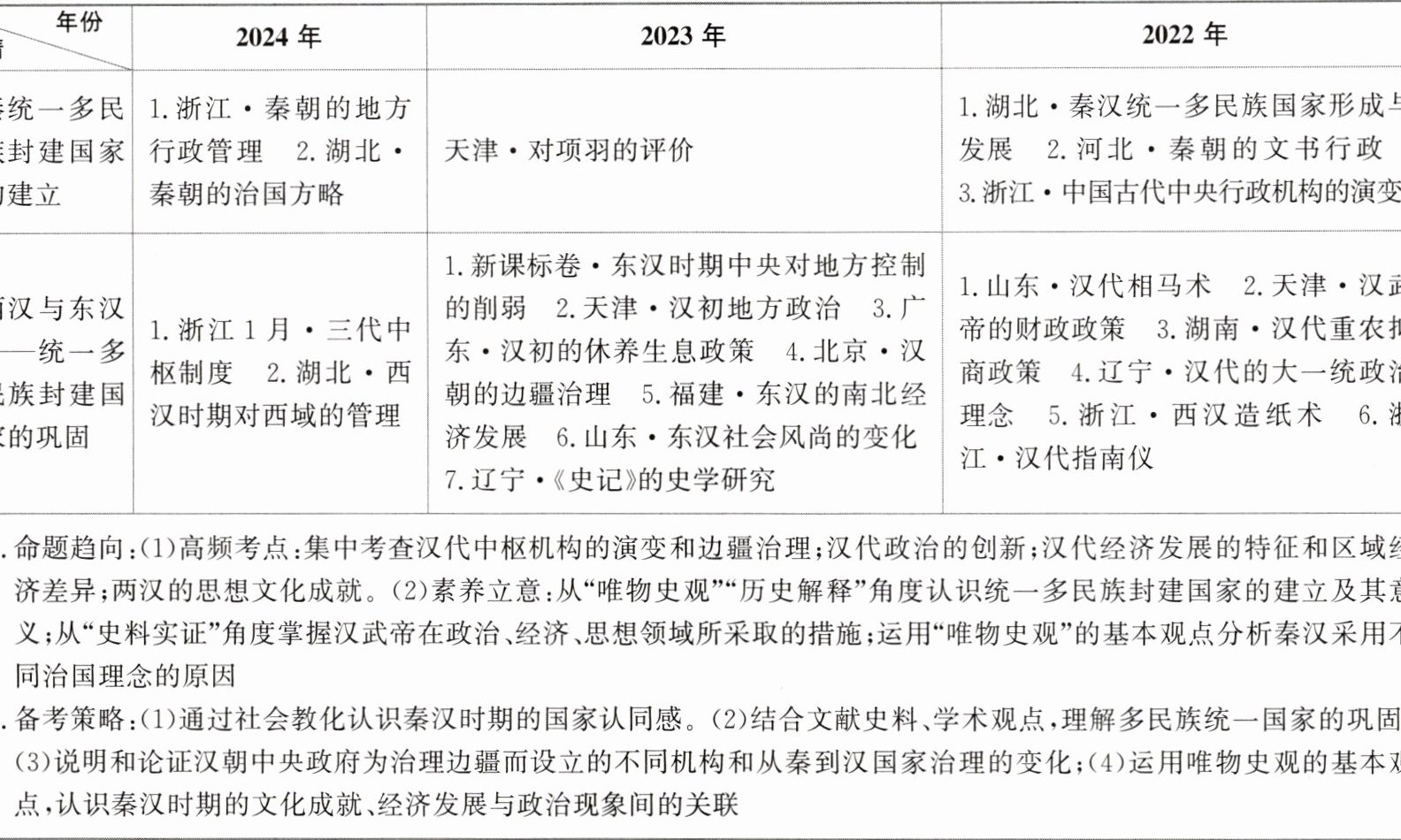 (1) 高频考点:集中考查汉代中枢机构的演变和边疆治理;汉代政治的创新;汉代经济发展的特征和区域经济差异;两汉的思想文化成就。