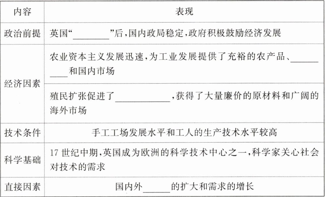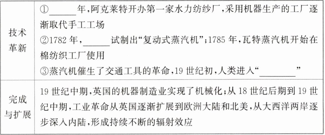 (1) 内涵:工业革命是由一系列技术变革引起的从手工劳动转向机器生产的重大飞跃。