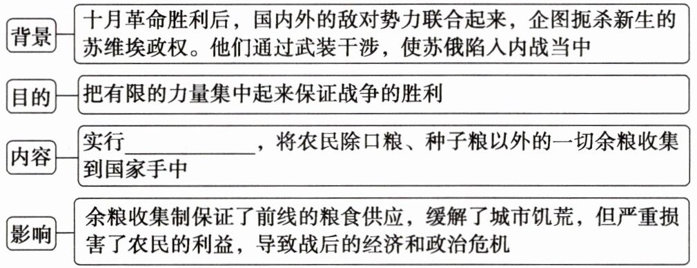 ,将农民除口粮、种子粮以外的一切余粮收集到国家手中影响:余粮收集制保证了前线的粮食供应,缓解了城市饥荒,但严重损害了农民的利益,导致战后的经济和政治危机