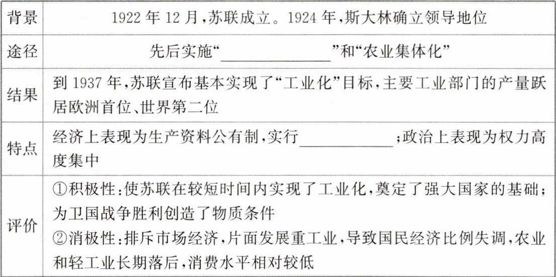 ;政治上表现为权力高度集中评价:①积极性:使苏联在较短时间内实现了工业化,奠定了强大国家的基础;为卫国战争胜利创造了物质条件