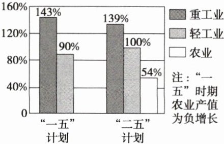 下面是苏联前两个“五年计划”时期工农业产值增长示意图。