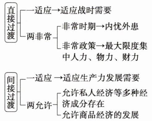 2. 间接过渡:因适应生产力发展需要,通过两允许(允许私人经济等多种经济成分存在、允许商品经济的发展)实现。