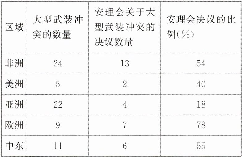 变式训练3. (2024·山东济南三模)下表是联合国安理会关于世界不同地区大型武装冲突决议的统计表(1986—1999年)。这可以用来说明安理会(