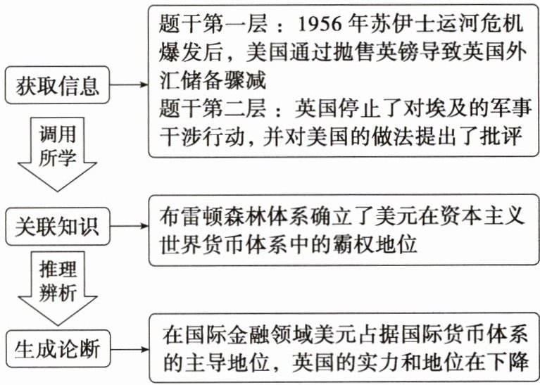 A 根据材料“大量抛售英镑”“对国际货币基金组织宗旨和精神‘不可饶恕的背叛”并结合所学可知,布雷顿森林体系确立了美元在资本主义世界货币体系中的霸权地位,美国利用美元在国际货币体系中的主导地位迫使英国停止对埃及的军事干涉,故选A项;材料中中国的行为是出于自身利益的考虑,并没有支持埃及民族解放运动,排除B项;布雷顿森林体系走向瓦解是在20世纪70年代初,与材料时间不符,排除C项;材料仅说明美英在埃及问题上存在分歧,并不能说明西方大国间盟友关系破裂,排除D项。