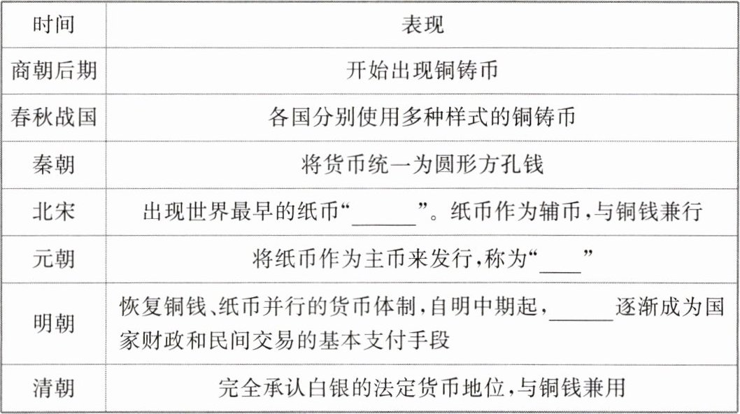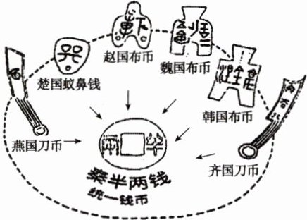 1.战国时期,诸侯国长期并立,各国铸币形式多样;秦完成统一后,统一货币,在全国推广圆形方孔钱(秦半两)。货币变化反映了中国从分裂走向统一的历史趋势。