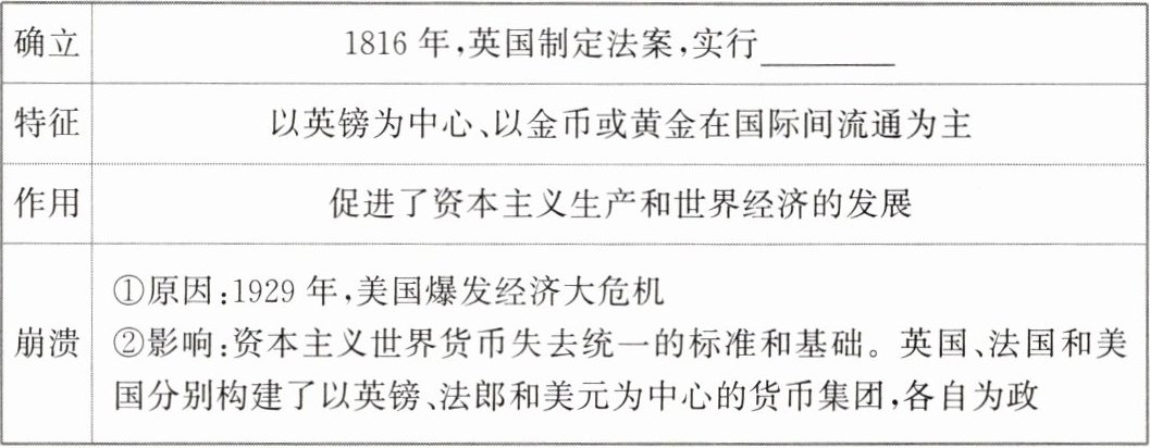 ②影响:资本主义世界货币失去统一的标准和基础。英国、法国和美国分别构建了以英镑、法郎和美元为中心的货币集团,各自为政 |