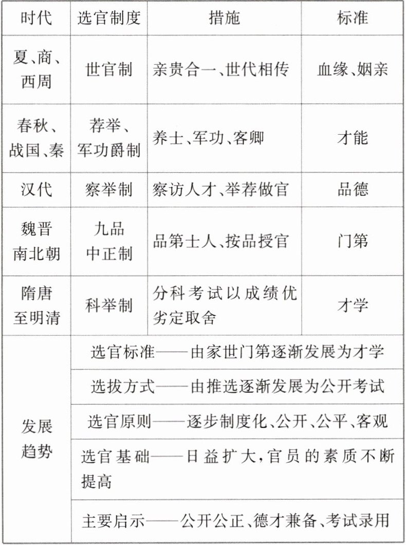 2.C 据材料“基于‘先天’的家世和‘后天’的德行”“把‘后天’因素融入‘先天’因素考量”可知,魏晋士人乡品的评定标准是家世和德行,但在中正实际授乡品过程中往往把“后天”的德行融入“先天”的家世考量,这说明中正授予乡品更重视家世,这导致世家大族垄断仕途的局面,加剧了社会阶层固化,故选C项;中正官是中央官员,九品中正制将选官权收归中央,加强了中央集权,不会导致选举权地方化,排除A项;九品中正制下由中正官授予乡品,以家世为主要考量因素,具有很大的主观性,不能得出“趋于理性”的结论,排除B项;据材料“把‘后天’因素融入‘先天’因素考量”可知,这一现象体现出重官员的门第而不是文化素质,排除D项。