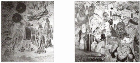对应练5. (2025·广东揭阳模拟)下面两幅图是甘肃敦煌莫高窟第220窟(7世纪)部分壁画。左图是中国君臣图。右图人物形象中,有的上身半裸,有的身材高大,有的头戴羽帽,可能来自朝鲜半岛,有的肤色黝黑,有的头发卷曲,人物肤色和服饰均与左图不同。这说明当时(