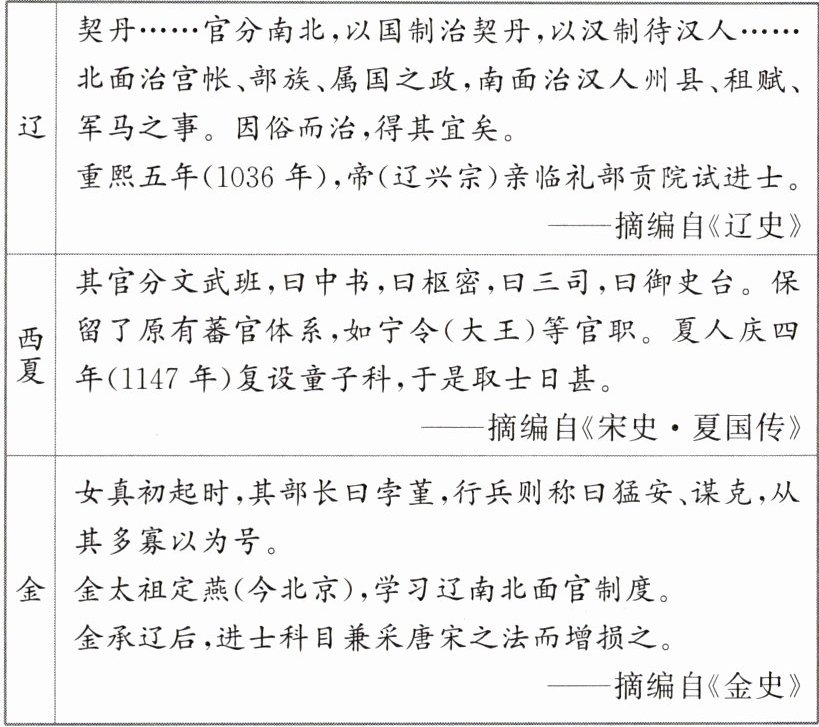 探究:根据材料和所学知识,比较辽、西夏、金制度的相同之处,并从民族政权并立与民族交融角度,谈谈你的认识。
