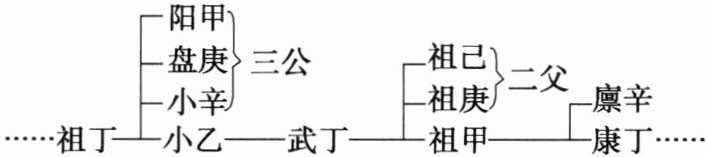 C “三公二父”是商王康丁的五位旁系先王,他们经常一起受祀,但是康丁的直系先王祖甲多数情况下都是单独受祀,这是强化了直系血缘纽带关系的表现,故选C项;嫡长子继承制确立于西周,与题干时间不符,排除A项;图示都是继承关系的结果,未涉及继承关系的来源,所以据此无法得出“兄终弟及方式渐趋成熟”的结论,排除B项;题干涉及的是商王家族内部的血缘关系亲疏问题,而不是统治集团内部的等级问题,排除D项。