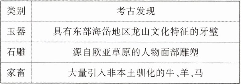 D 据表格“具有东部海岱地区龙山文化特征”“源自欧亚草原”“大量引入非本土驯化”等内容可知,陕西石峁遗址出土了东部地区、欧亚草原和非本土的家畜遗迹,反映出当时不同地区已经进行了一定程度的交流,故选D项;表格仅述及陕西石峁遗址的部分考古发现,如玉器、石雕、家畜,但是并没有述及贫富分化,排除A项;题干仅述及陕西石峁遗址这一处文明,并没有述及其他文明,不能得出“统一性”的结论,排除B项;表格仅述及陕西石峁遗址的部分考古发现,如玉器、石雕、家畜,但是并没有述及劳动分工,排除C项。