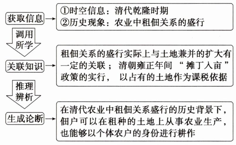 A 根据材料可知,李调元在《卖田说》中描述的“卖田以佃地”,指的是卖出自己的土地,租佃他人的土地,按约定缴纳地租,这种生产方式仍然建立在个体农耕的基础上,故选A项;租佃关系的盛行并不能遏制土地兼并,排除B项;租佃关系有利于商业货币经济的发展,而非“抑制”,排除C项;这一时期已经实行“摊丁入亩”,赋役征收主要根据土地的多少,与当时农业中租佃关系的盛行没有直接关系,排除D项。