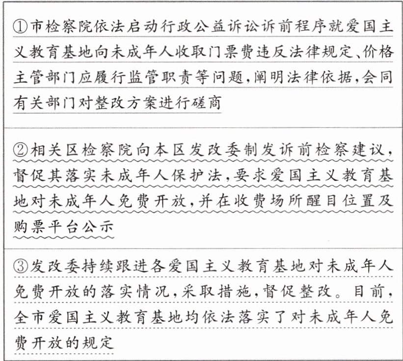 推进法律实施,市检察院就爱国主义教育基地向未成年人收取门票费违反法律规定等问题阐明法律依据;严格公正司法,相关区检察院向本区发改委制发诉前检察建议,督促政府履行监管职责和相关部门落实未成年人保护法;全面履行政府职能,发改委持续跟进督促爱国主义教育基地整改情况,严格公正执法;形成治理合力,提高社会治理法治化水平,推动全社会树立法治意识。